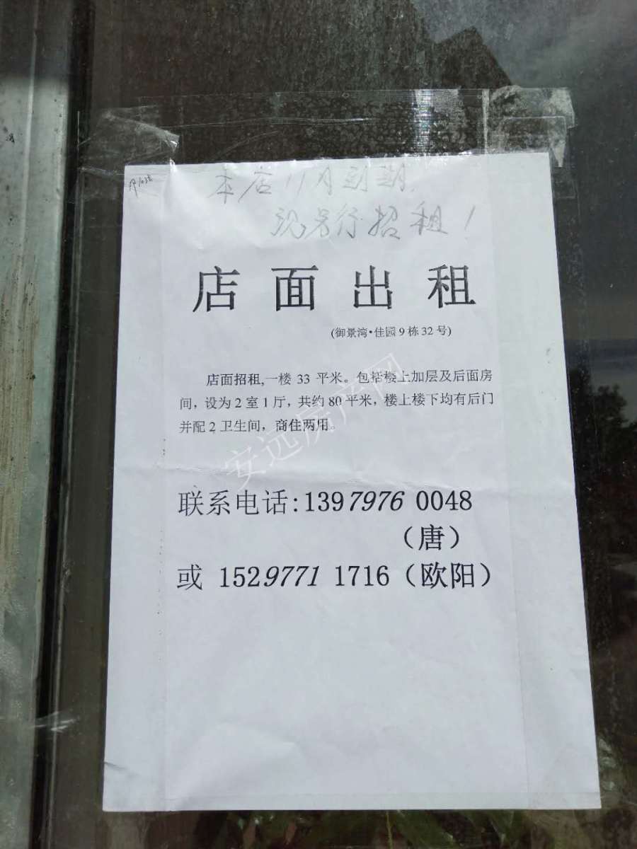 【店铺出租】本店原承租人已停止租赁,现将本店再予以出租。(店址:安远县城新溪路御景湾·佳园9栋32号,无为塔公园斜对面)联系人: 唐139****0048,欧阳152****1716。