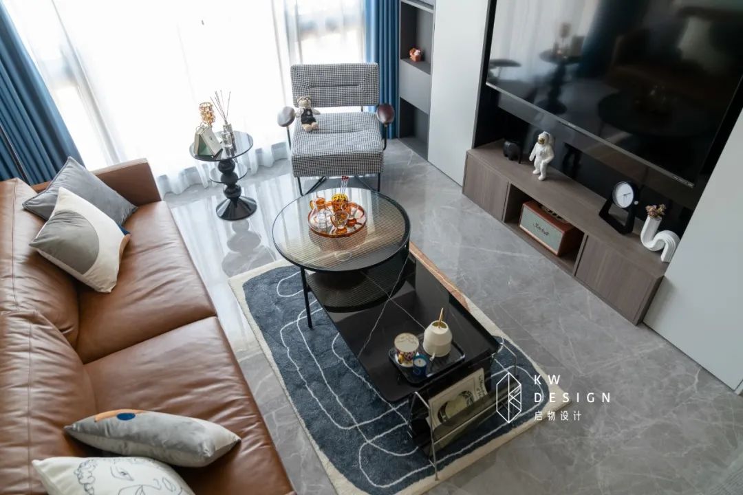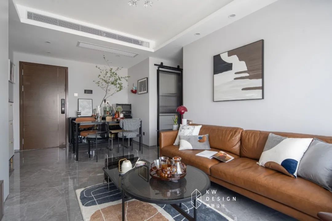 恰当尺寸的家具摆放可以重塑空间的尺度和包容感。对于三米开间以内的客厅选择深度在一米以内的两或三人位轻巧造型沙发搭配一个可移动沙发凳。地毯选择中规格尺寸,地面空间视觉上就会开阔很多。