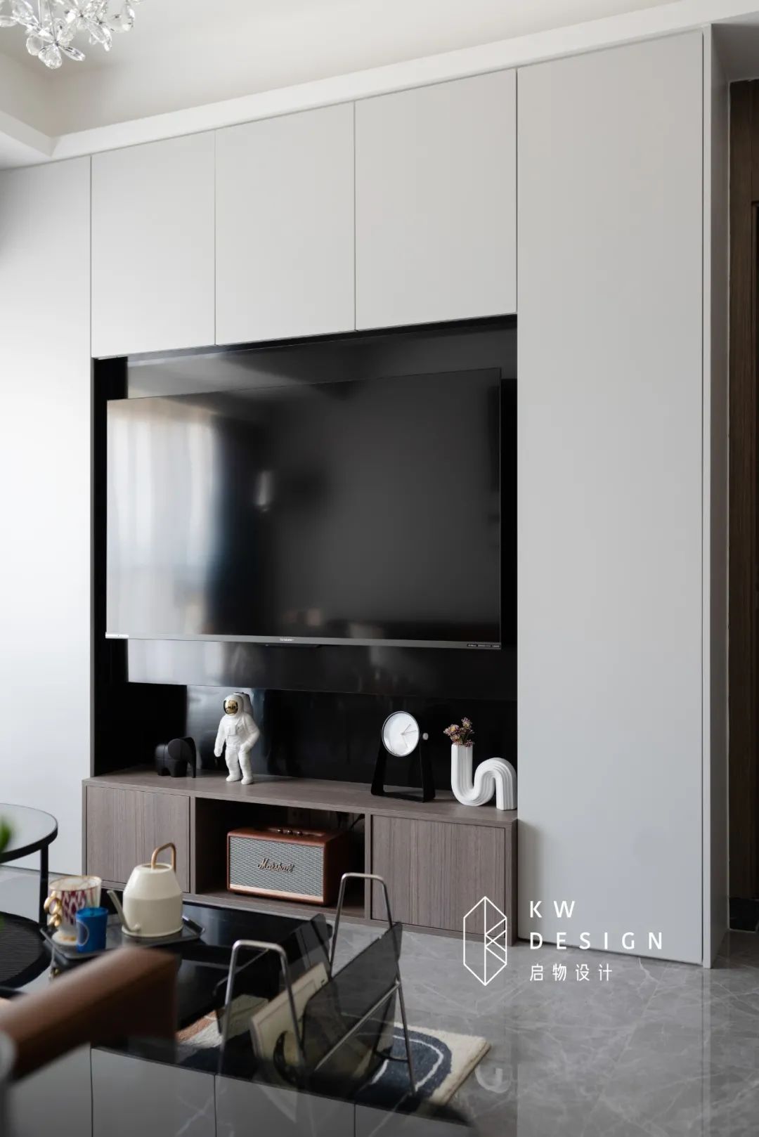 中间采用黑色不锈钢做镂空处理,刚好放下60寸的电视,拉大开间视觉效果同时丰富背景墙造型感,搭配复古棕的马歇尔音响,实现客厅的视听功能。