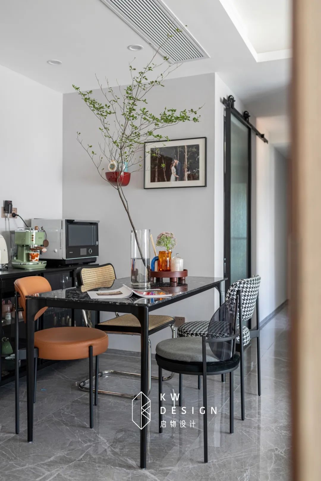 四款不同材质的餐椅,在这个空间里是俏皮活泼且和谐的,每一款都有呼应空间的元素。