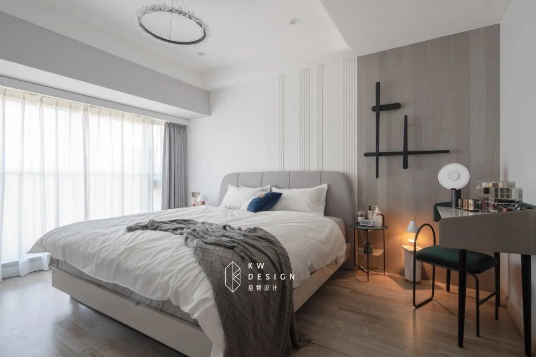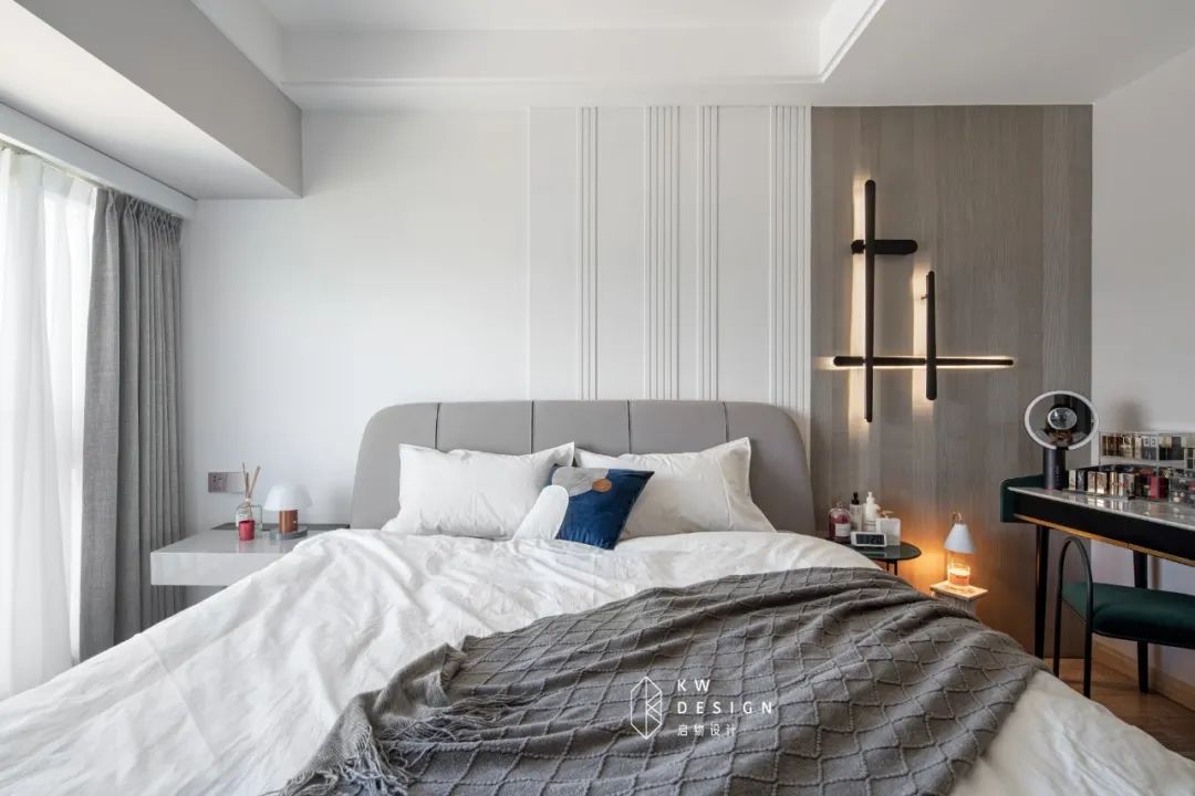 床头背景是白色木栅格+白栓木饰面墙的结合,搭配黑色复古长条十字壁灯,线条感和设计感让简约的卧室空间不简单。