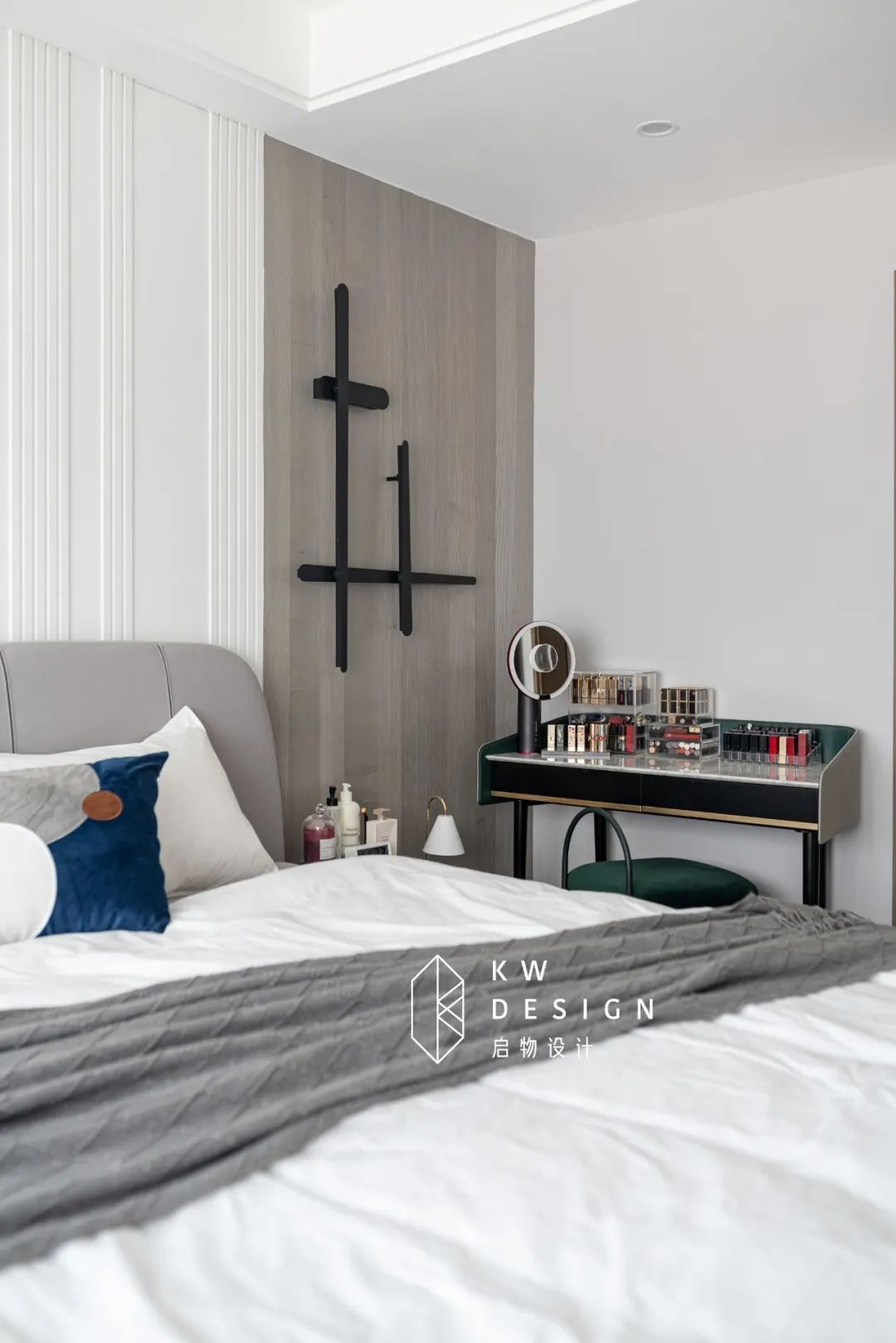 带圆角斜线设计的梳妆台装下主人的精致,墨绿色点缀静谧空间。