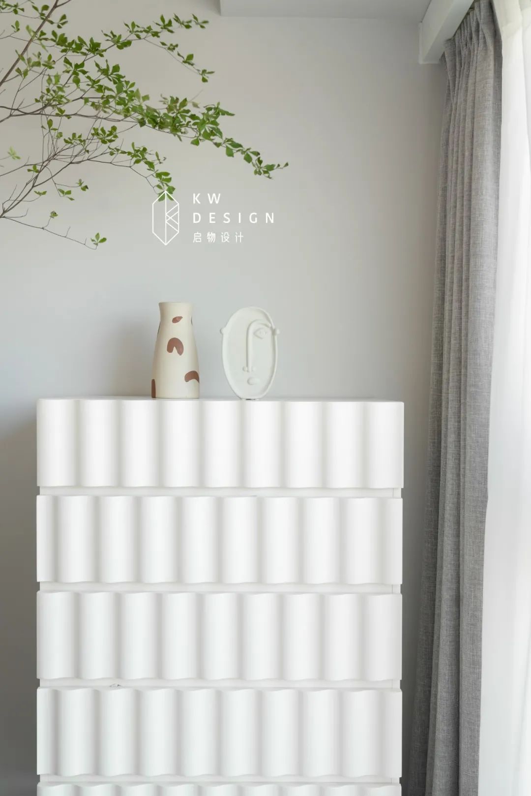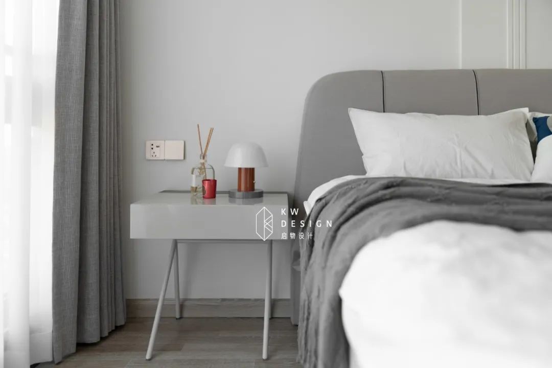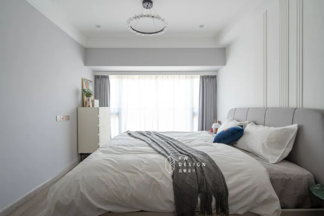 白色波浪面板的斗柜超温柔,与卧室静谧氛围相契合,上层放置海淘的奇珍异宝,下层抽屉收纳贴身衣物或书本,方便美观。