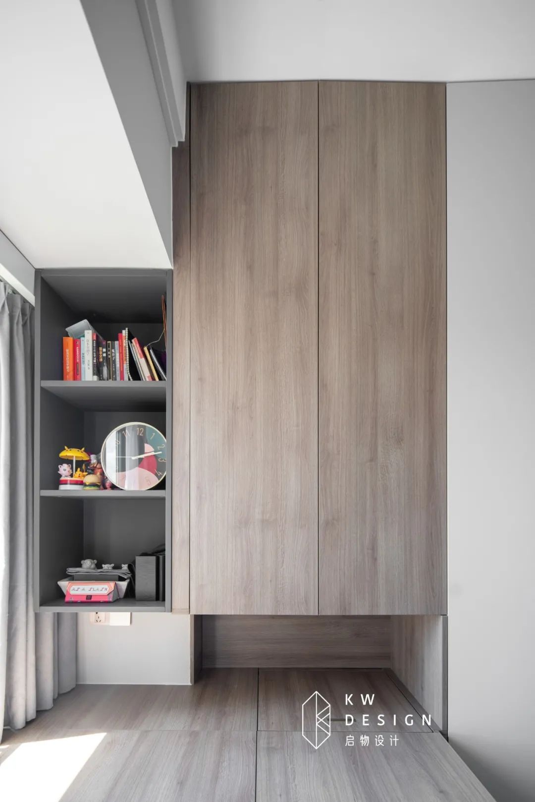 多功能房采用深色沉稳木色和亮白色面板做拼色设计,灰色开放格点缀素雅空间。